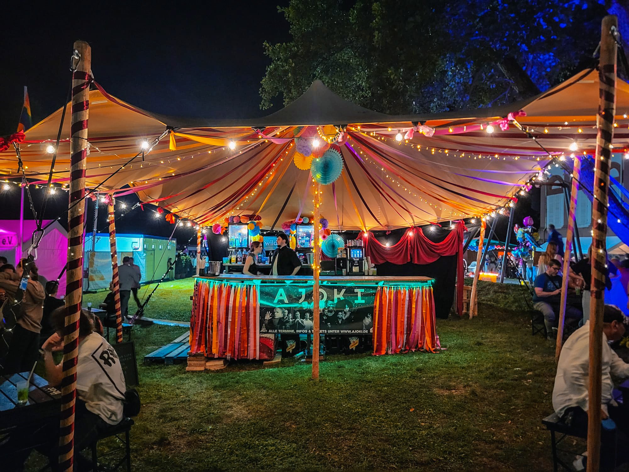 ❤️Colourful Lanterns ❤️The fabric and ribbon ceilings ❤️Festoon lighting ❤️ A covered bar ❤️ Textiled seating areas, however worried about using nice fabrics for the upcoming event ❤️ The colourful archway, however, not practical for the upcoming event