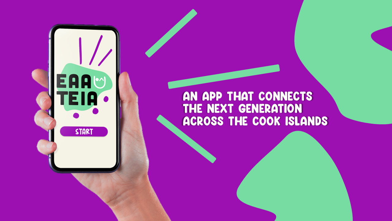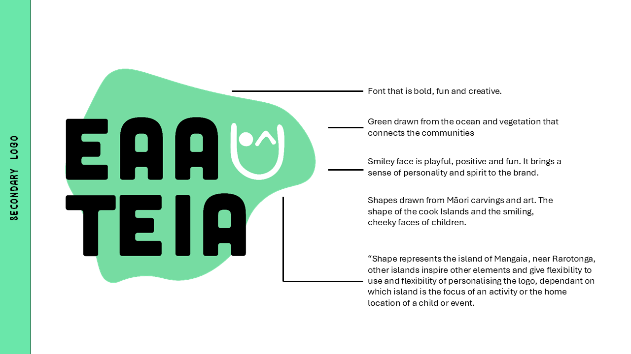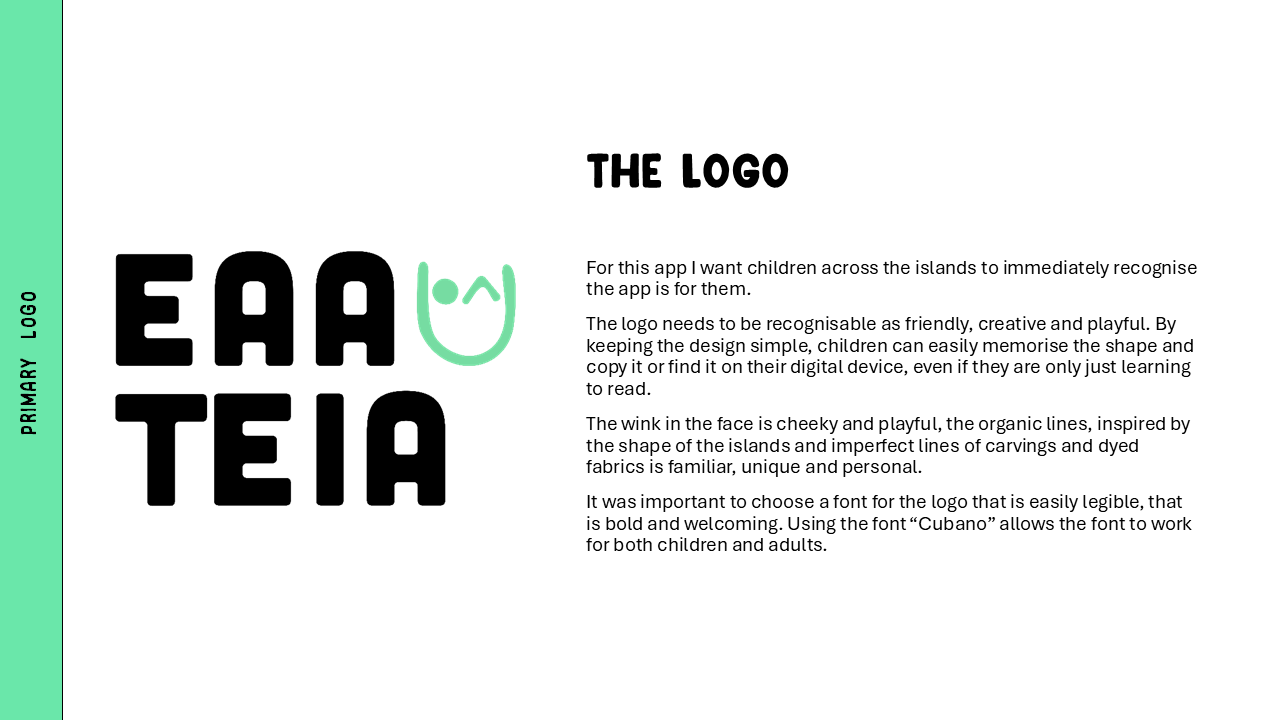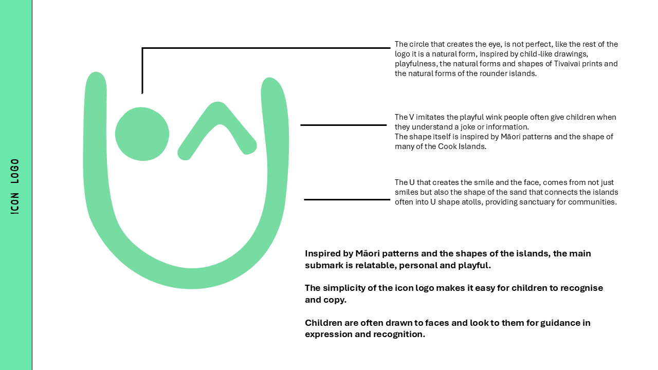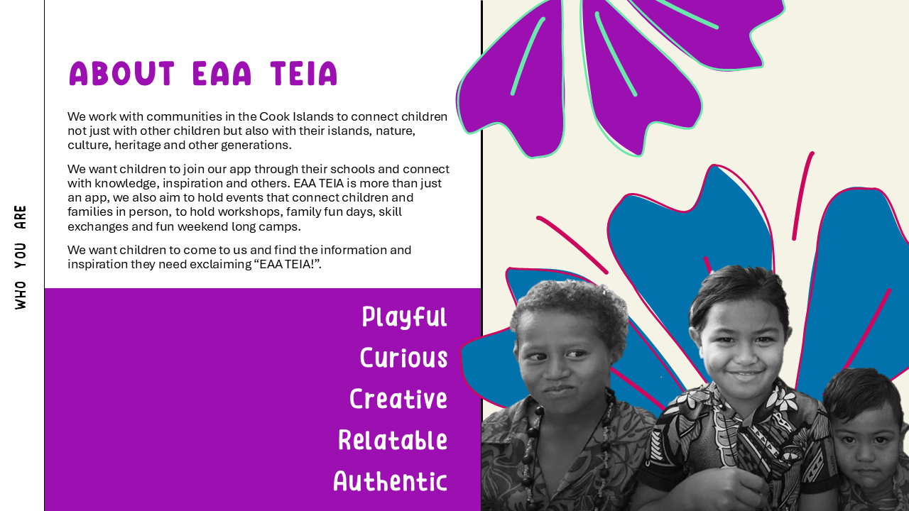Create a company and brand identity that is in the arts and recreation industry, related to tech for children living on the Cook Islands. The company is thoughtful, spirited and playful.