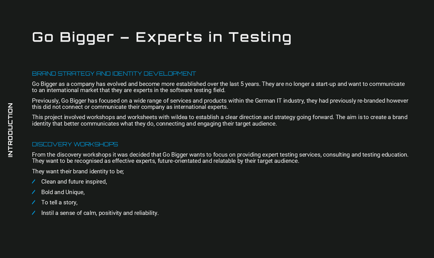 As a company Go Bigger advertised themselves as “Specialised in IT”, with a large range of services, projects, ideas and employee skills. During our initial discussions we found that this was too broad a description and range of services, therefore it would be of use to find their specialism and a clear target audience.