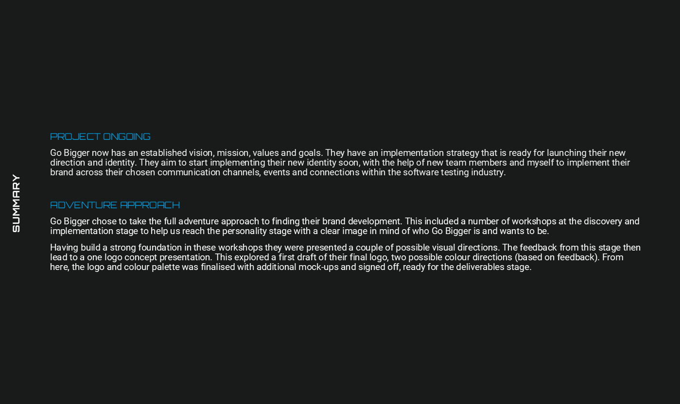 After an initial talk with Go Bigger, I found that they had a real need to discover who their company is and a establish a clear vision, mission, goals and strategy.