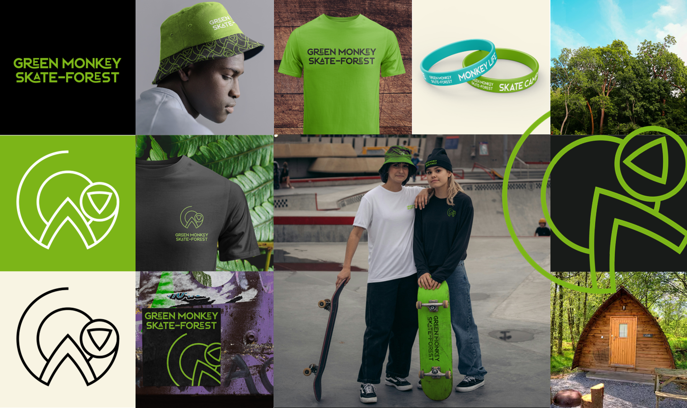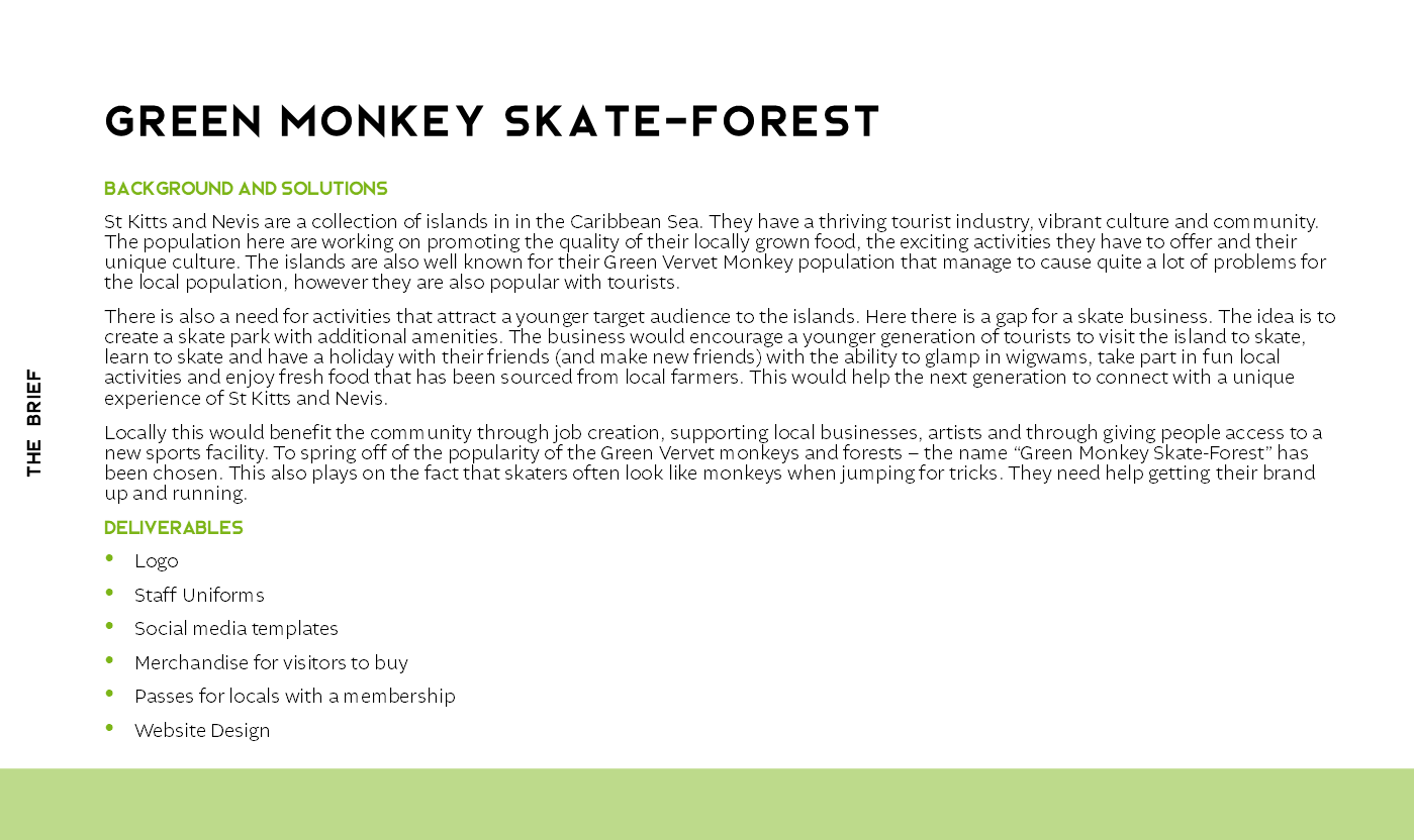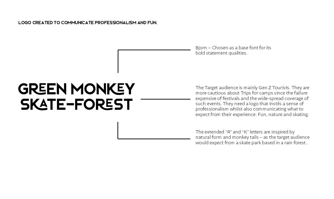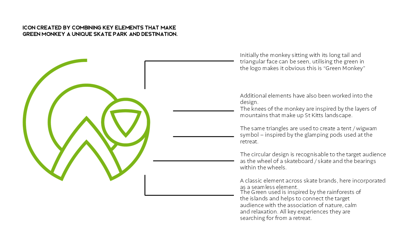 Create a company and brand identity for a skate park retreat on the islands of StKitts. The company offers glamping, skate workshops and more whilst guests are surrounded by the beautiful forests and green vervet monkeys that the island is known for.