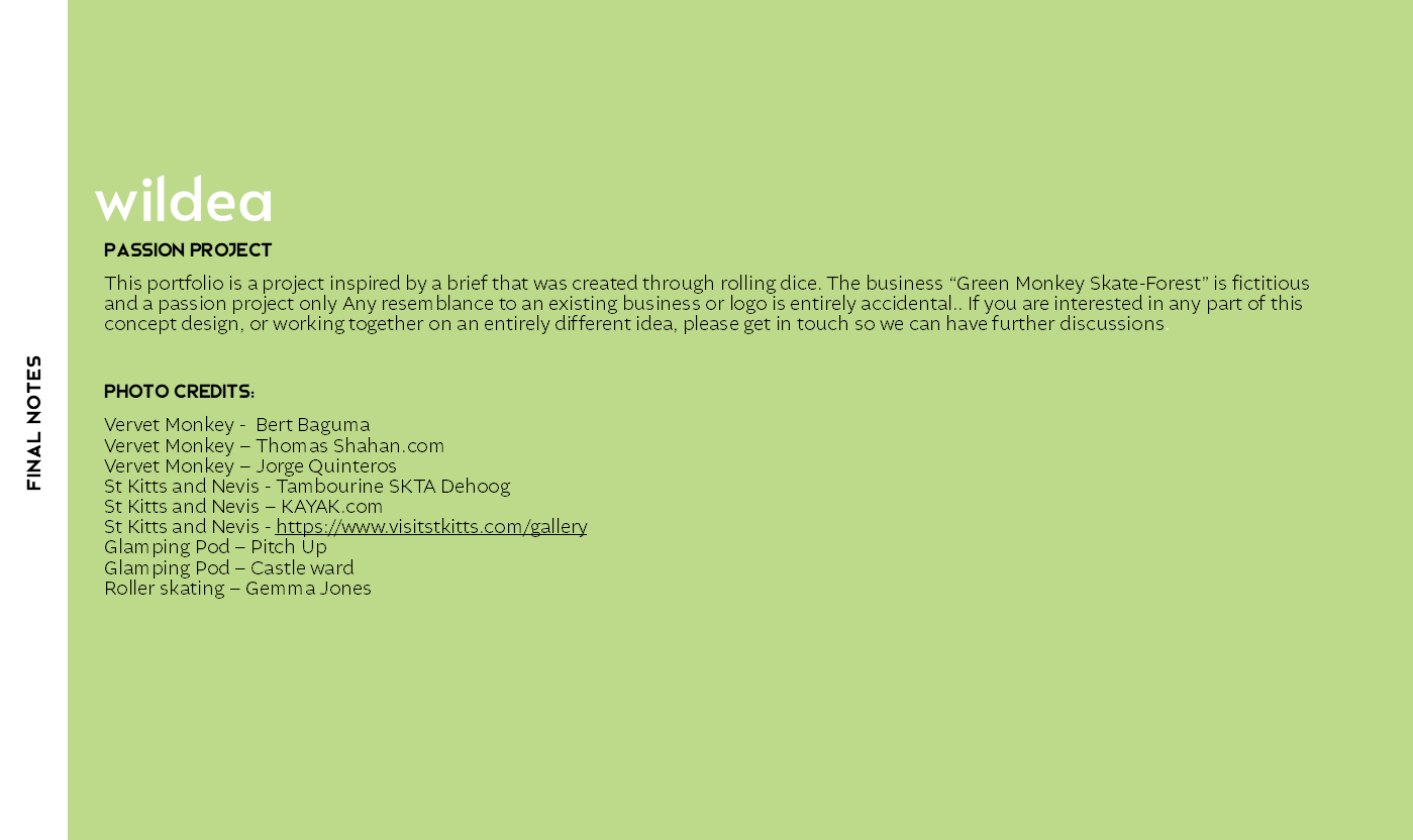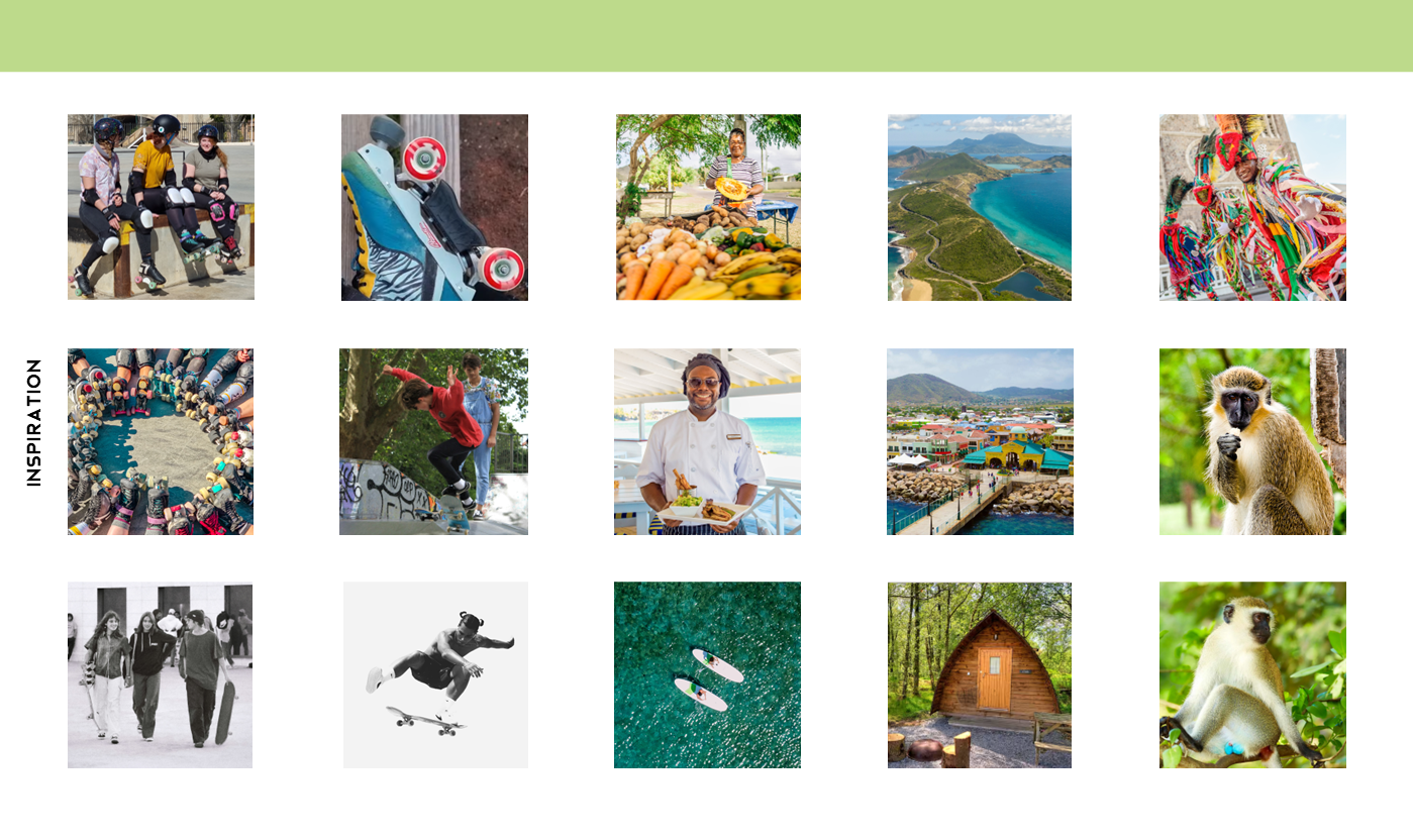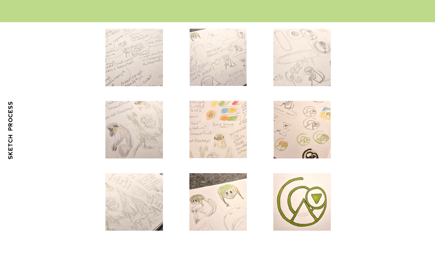 Create a company and brand identity for a skate park retreat on the islands of StKitts. The company offers glamping, skate workshops and more whilst guests are surrounded by the beautiful forests and green vervet monkeys that the island is known for.