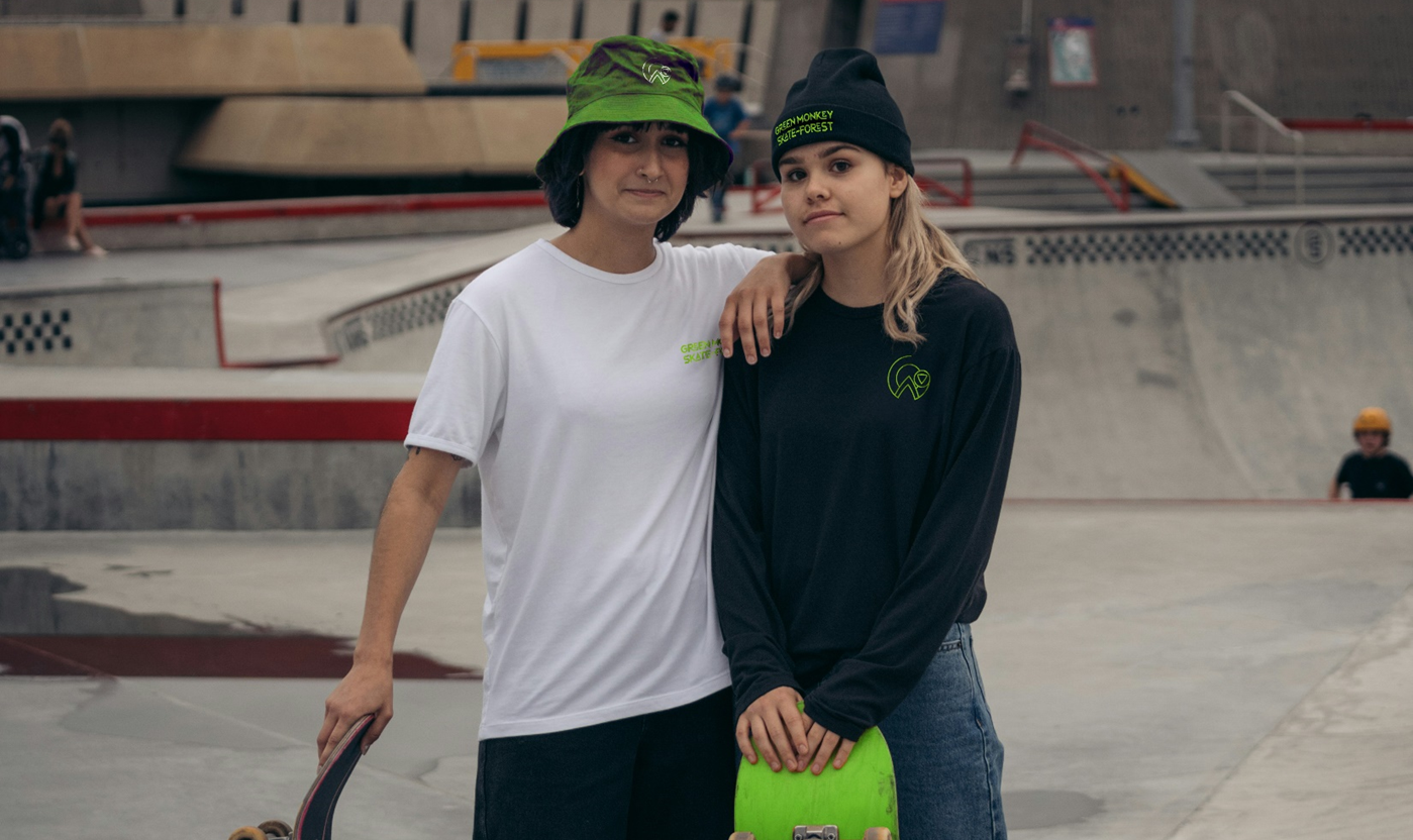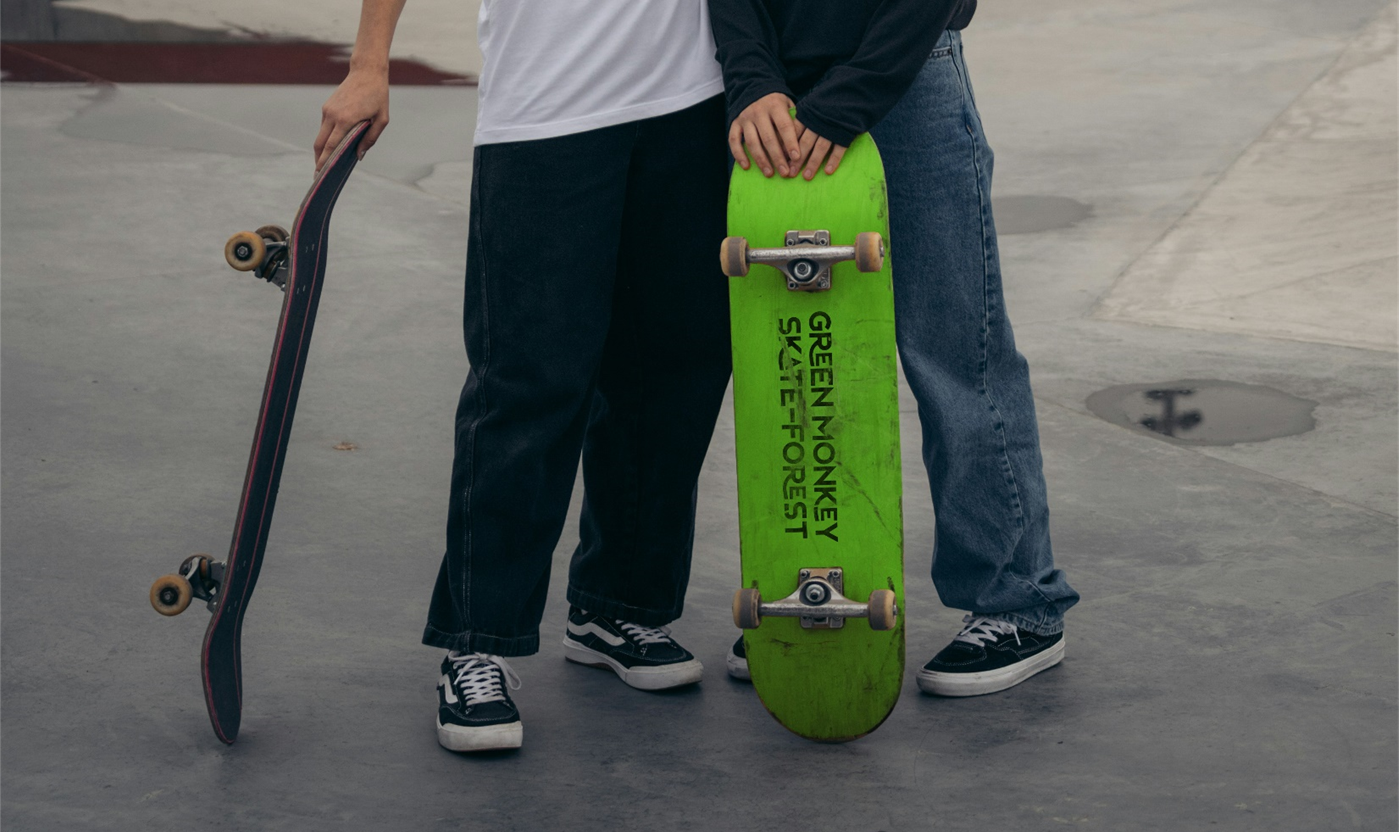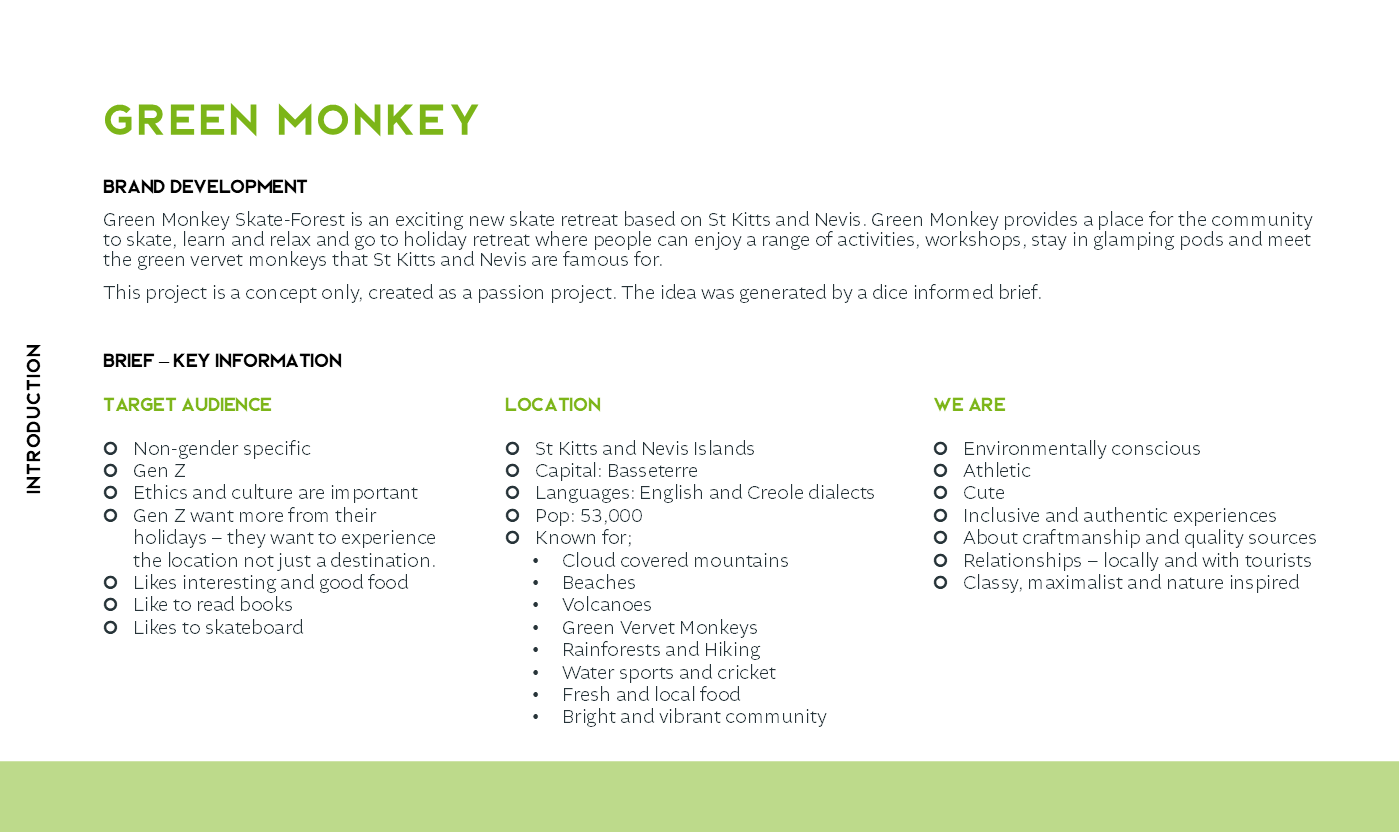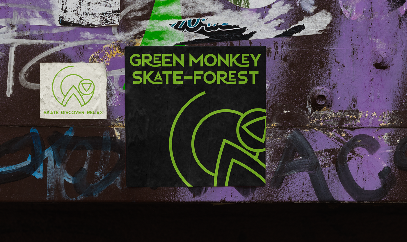 Create a company and brand identity for a skate park retreat on the islands of StKitts. The company offers glamping, skate workshops and more whilst guests are surrounded by the beautiful forests and green vervet monkeys that the island is known for.